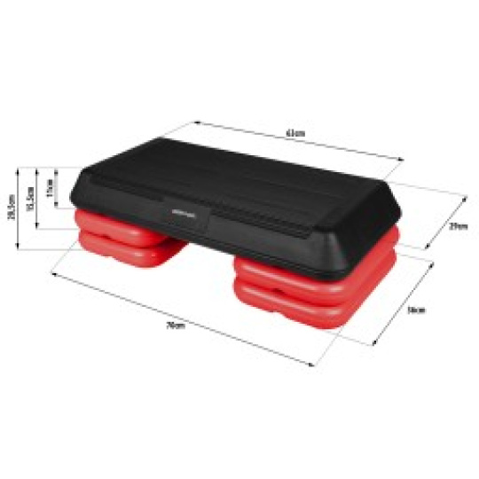 Step na aerobic s dvojstupňovou reguláciou výšky. Step si ľahko nastavíte podľa vlastnej potreby tréningu. Protišmykový povrch vám umožní bezpečný a pohodlný priebeh cvičenia doma alebo v posilňovni. Aerobic step je ideálny pomocník na zlepšenie kondície a udržanie formy, tvaruje svaly dolných a horných končatín a brušné svaly. Je vhodný pre individuálne i skupinové cvičenia.