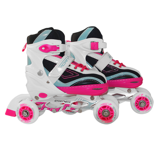 Nastaviteľné detské korčule pre začínajúcich korčuliarov. Vďaka možnosti dať kolieska do zadnej pozície vedľa seba sú korčule ideálne na učenie korčuľovanie. Gumené kolesá nerobia hluk ako plastové kolesá, nekĺzajú po povrchu, vďaka čomu je jazda oveľa stabilnejšia. Taktiež nehrozí rozbitie kolesa počas jazdy. Bezpečnostná brzda a šír