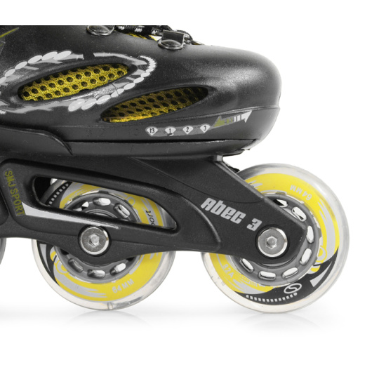 - V závislosti od stupňa pokroku vo výučbe jazdy sa kolieskové korčule môžu rýchlo zmeniť na kolieskové korčule vďaka systému zmeny polohy kolies.