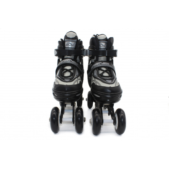 Nastaviteľné detské korčule pre začínajúcich korčuliarov. Vďaka možnosti dať kolieska do zadnej pozície vedľa seba sú korčule ideálne na učenie korčuľovanie. Gumené kolesá nerobia hluk ako plastové kolesá, nekĺzajú po povrchu, vďaka čomu je jazda oveľa stabilnejšia. Taktiež nehrozí rozbitie kolesa počas jazdy. Bezpečnostná brzda a šír