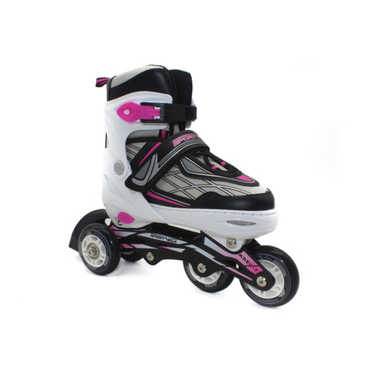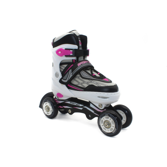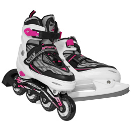 Kolieskové korčule s vymeniteľným zimným nožom a nastaviteľnou veľkosťou. Ideálne korčule pre celoročné využitie. Viacúrovňové zapínanie na šnúrky, suchý zips a spona spevní členok a zaistí pohodlnú jazdu. Hliníkový podvozok a kvalitné ložiská zaručujú stabilitu kolieskové korčule. Kolieskové korčule ľahko vymeníte za zimný nôž na ľadovú