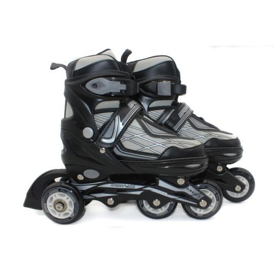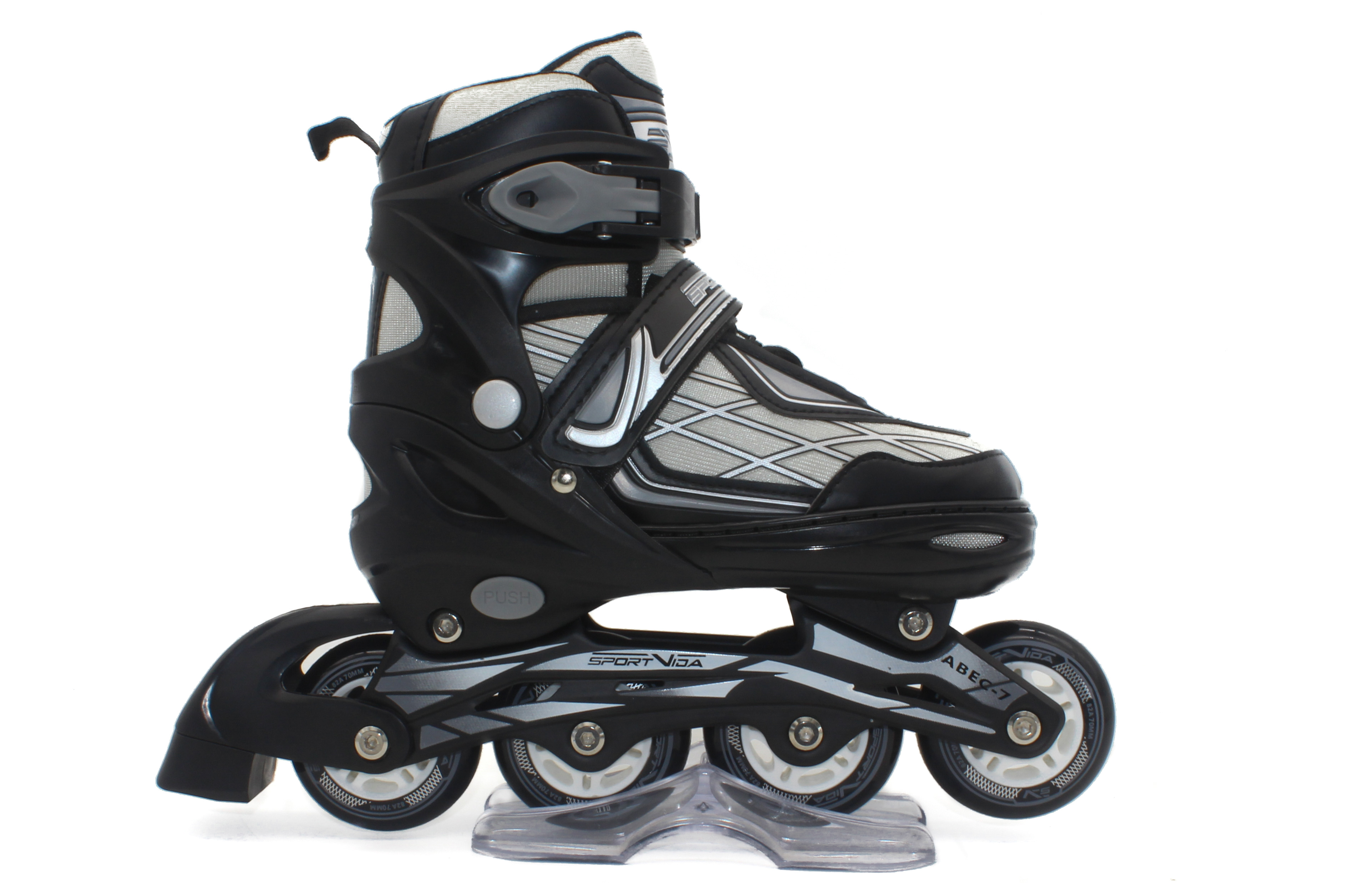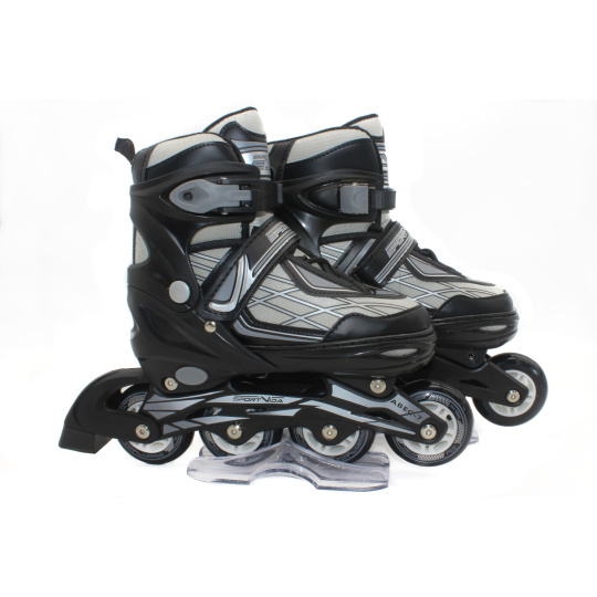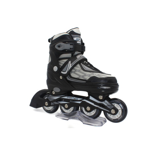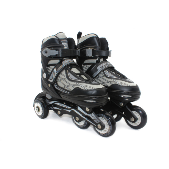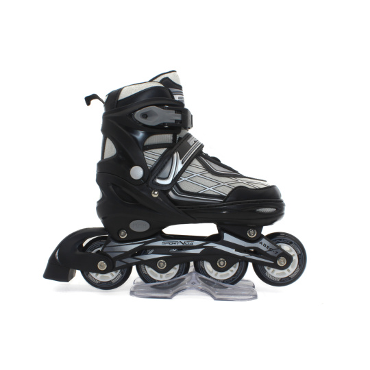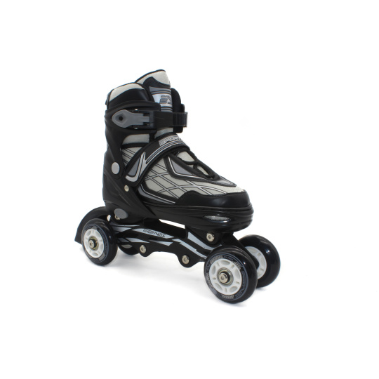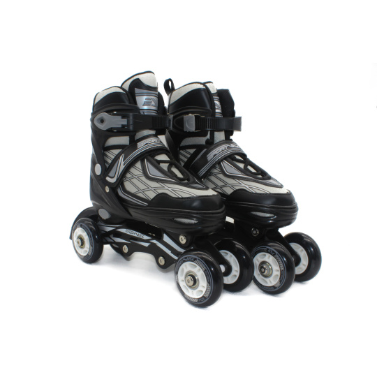 Nastaviteľné detské korčule pre začínajúcich korčuliarov. Vďaka možnosti dať kolieska do zadnej pozície vedľa seba sú korčule ideálne na učenie korčuľovanie. Gumené kolesá nerobia hluk ako plastové kolesá, nekĺzajú po povrchu, vďaka čomu je jazda oveľa stabilnejšia. Taktiež nehrozí rozbitie kolesa počas jazdy. Bezpečnostná brzda a šír
