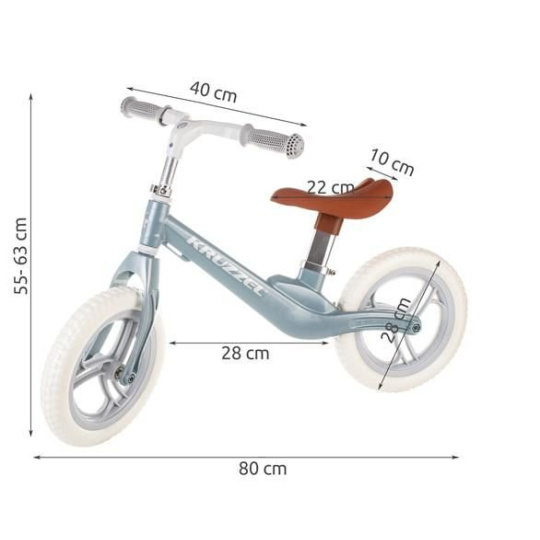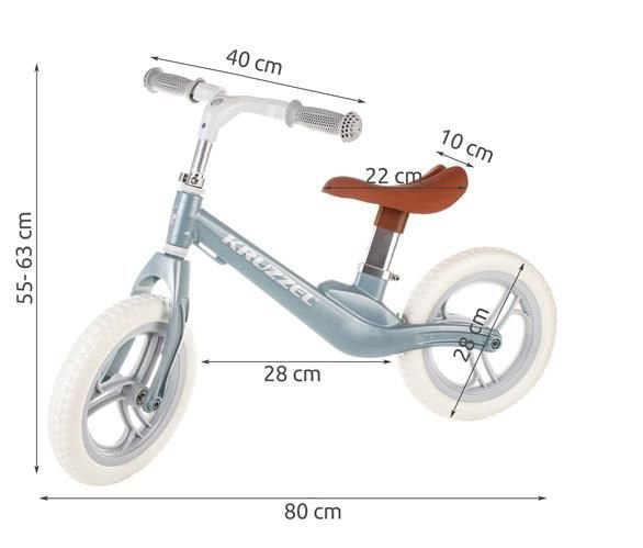 ŠPECIFIKÁCIA - farby: ružová, modrá; materiál: hliník s horčíkom, PU, guma; materiál kolies: pena EVA; nastavenie sedla: 35-40 cm; nastavenie volantu: 55-63 cm; priemer kruhu: 30 cm; rozmery (dĺžka / šírka / výška): 90/40/62 cm váha: 2,5 kg; hmotnosť v balení: 4 kg