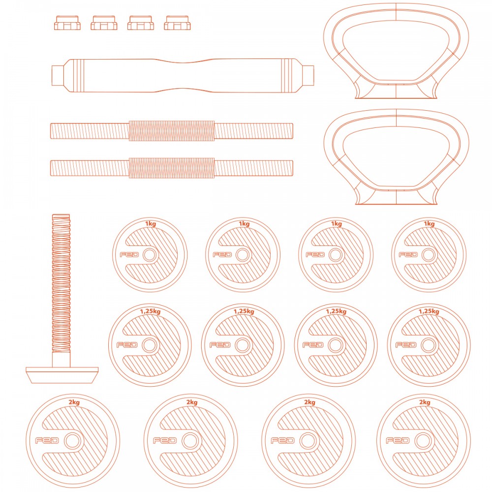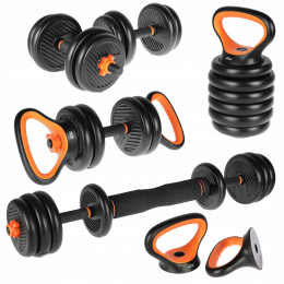 Môžete ľahko cvičiť pomocou kettlebell, činky alebo jednoručných činiek. Rukoväte na skladanie kettlebellov je možné zároveň využiť ako držiaky na kľučky, vďaka ktorým môžeme s jednou sadou vykonávať celotelový tréning. Tyčový konektor, pomocou ktorého môžete zo sady vytvoriť činku, má penové polstrovanie, ktoré je ideálne pre drepy.