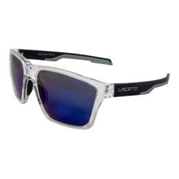 Elegantné slnečné okuliare Laceti MEMPHIS s lesklými transparentnými obrúčkami. Nožičky okuliarov sú matné čierne so šedými detailmi. Sklá okuliarov MEMPHIS sú modrá REVO s kategóriou filtra 3, takže priepustnosť svetla je 8-18%.