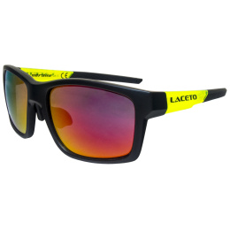 Čierne slnečné okuliare značky Laceti VERANO s matným povrchom, priehľadnými zelenými stranicami a pružnými koncovkami a nosníky. Okuliare sú vhodné pre bežné nosenie. Ich sklá sú červená REVO. Kategórie podľa stupňa protislnečnej ochrany je na tretej úrovni a použité filtre sú 100% UVA, UVB a UVC.