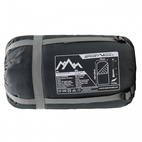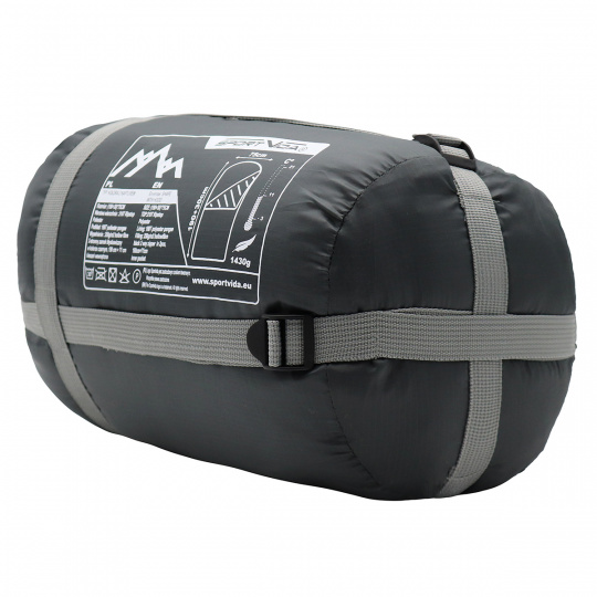 Spacák značky Sportvida je vyroben z vysoce kvalitního materiálu RIPSTOP se zvýšenou odolností proti mechanickému poškození a kombinuje výhody přikrývky a spacáku ve tvaru mumie. Pevná šířka spacáku a kapuce zaručuje maximální pohodlí a udržení teploty během používání. Výrobek má funkci WINDSTOP. Výplní používanou v tomto spacáku je vlákno HOLLOW FIBER s hmotností 250 g / m2, které má velmi vysoké tepelné parametry. Výhodou tohoto vlákna je zadržování tepla uvnitř spacáku a transport vlhkosti ven ze spacáku.